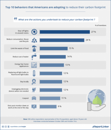 Some of the ways Americans engaged in avoiding negative environmental consequences include shutting off lights in unused rooms (27 percent), reuse and to recycle (24 percent), limiting their waste of food (15 percent), reducing their use of water (14 percent) and buying Energy Star home appliances (13 percent).