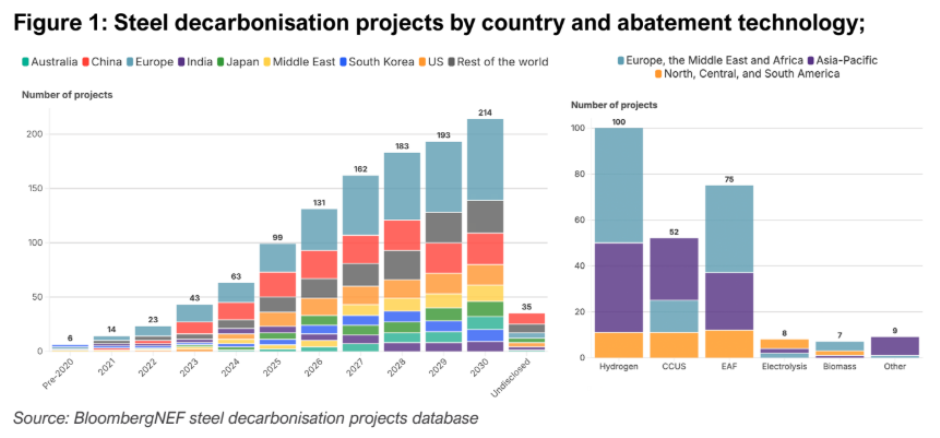 According to BNEF data, nearly US$24 billion has been injected into steel decarbonisation projects that are at various stages of design, construction, and commissioning.
