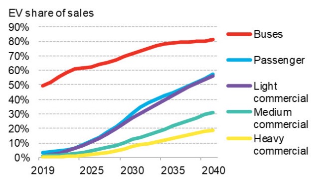 BNEF’s Electric Vehicle Outlook 2019 shows electrics taking up 57 percent of the global passenger car sales by 2040. Electric buses are set to hold 81 percent of municipal bus sales by 2040.