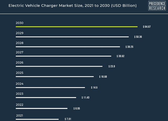 The global electric vehicle (EV) charger market size is expected to surpass around $64.67 billion by 2030 with a CAGR of 28 percent from 2022 to 2030, according to Precedence Research. The size of the global EV charging business was $7.01 billion in 2021.