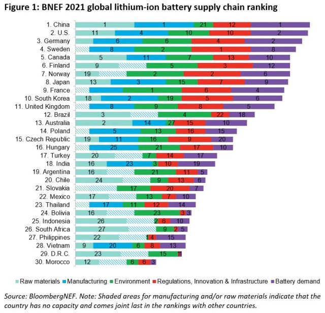 BNEF ranks 30 leading countries across the lithium-ion battery supply chain based on 41 metrics across five key themes: availability and supply of key raw materials; manufacturing of battery cells and components; local demand for electric vehicles and energy storage; and policy and environmental considerations.