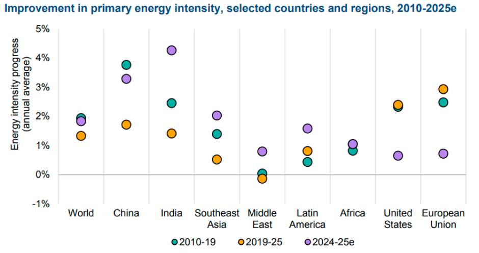 Energy intensity progress in 2025 is expected to exceed 3 percent in China and 4 percent in India. These rates are well above their averages since 2019 and show strong momentum in major emerging economies.