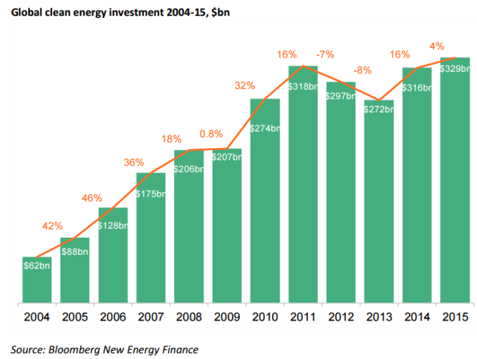 Renewable energy investment in global markets rose 4 percent to $328.9 billion from $315.9 billion in 2014, said Bloomberg New Energy Finance.
