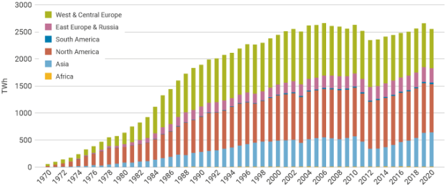 In 2020 nuclear plants supplied 2553 TWh of electricity, down from 2657 TWh in 2019. Prior to 2020, electricity generation from nuclear energy had increased for seven consecutive years.