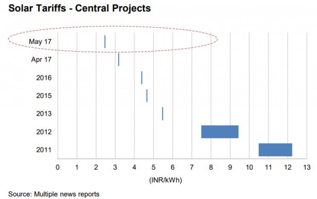 Solar tariffs in India fell to the lows of INR2.44 / kWh in May 2017. Future solar tariffs will be subject to extension of fixed tariffs by China and advance orders by developers amid antidumping investigations.