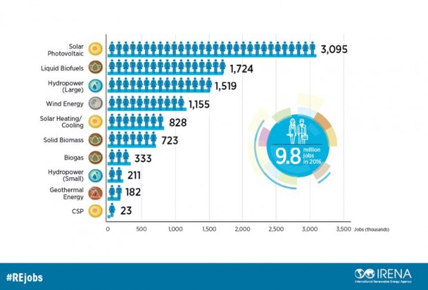 More than 9.8 million people were employed in the renewable energy sector in 2016, and 62 percent of these jobs are located in Asia, according to a new report from the International Renewable Energy Agency (IRENA).