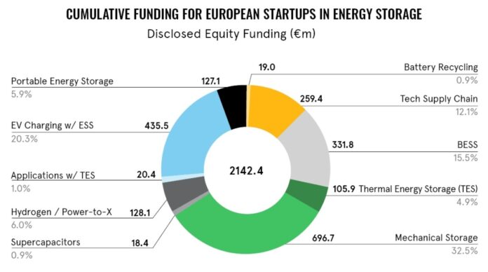 Mechanical energy storage has emerged as the largest funding category, attracting €696.7 million in equity investment. This is more than double the funding directed toward BESS, despite fewer companies operating in the space and fewer reaching full commercial maturity.