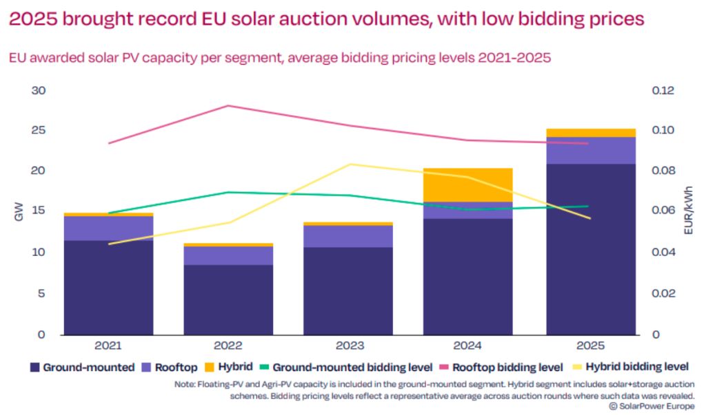 Overall, solar auctions have become a cornerstone of the EU’s renewable energy strategy. By the end of 2025, approximately one-quarter of the European Union’s installed solar PV capacity originated from projects supported through auction mechanisms.