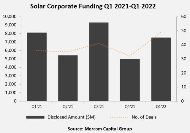 Total corporate funding in the solar sector rose 51 percent to $7.5 billion in 49 deals in Q1 2022 from $5 billion in 32 deals in Q4 2021. Funding decreased by 7 percent year-over-year compared to Q1 2021, as per a report from Mercom Capital Group.