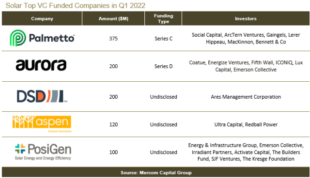 The top VC-funded deal in Q1 2022 was the $375 million raised by Palmetto. Of the $1.2 billion in VC funding raised in 26 deals during Q1 2022, 94 percent went to solar downstream companies, with $1.15 billion in 20 deals.