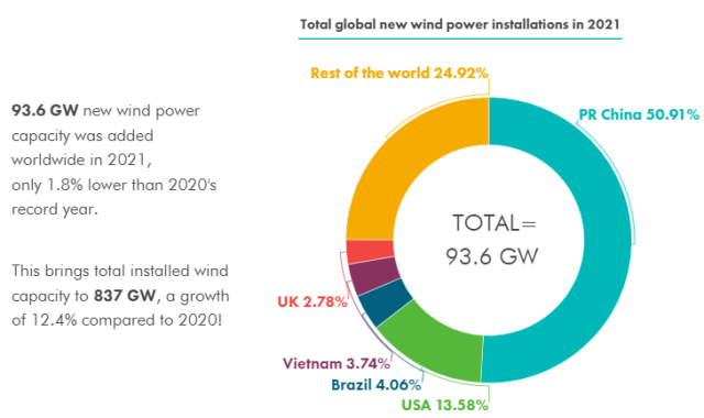 The global wind industry added almost 94 GW of capacity globally in 2021, trailing behind the 2020’s record growth by only 1.8 percent.