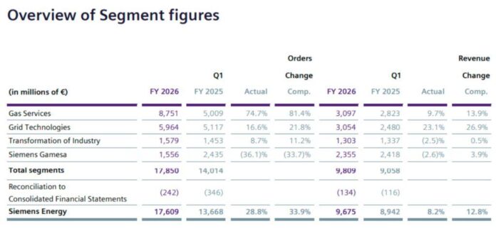 The company’s Grid Technologies segment led performance with 26.9 percent comparable growth, followed by Gas Services with 13.9 percent growth. Siemens Energy reported total orders of €17.6 billion, supported by record order intake in Gas Services, while both Grid Technologies and Transformation of Industry achieved double-digit order growth.